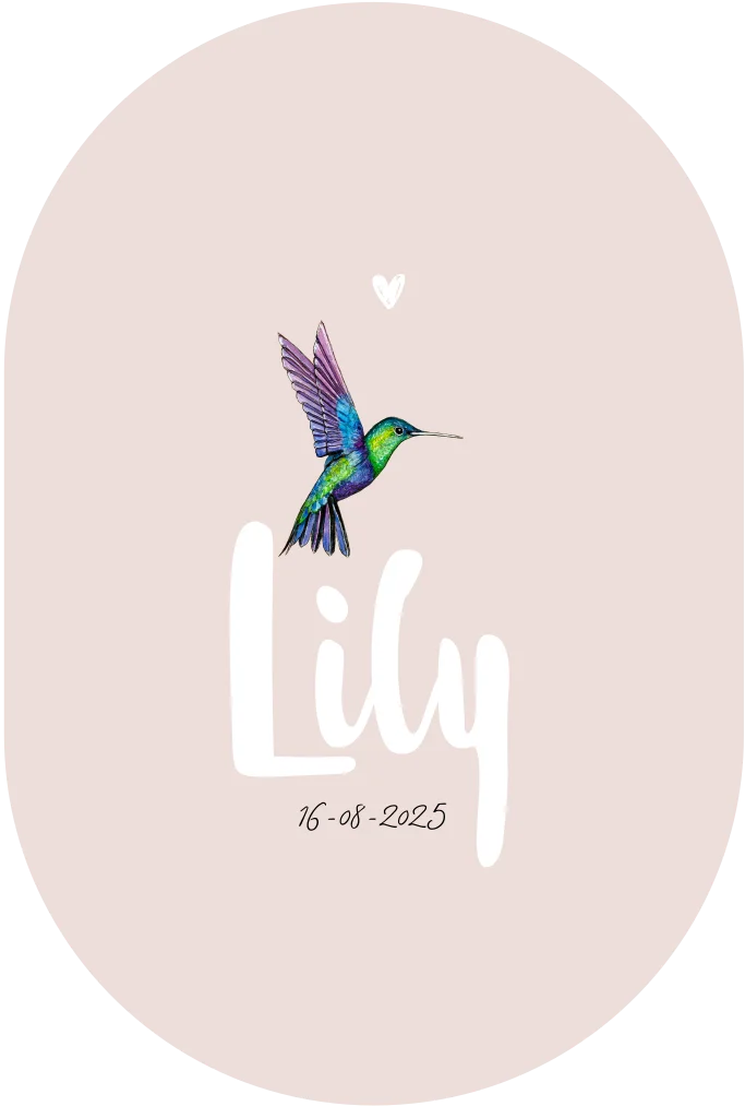 Geboortekaartje meisje met kolibrie, met de hand getekend en afgewerkt met aquarel. Maak van dit geboortekaartje met een bijzondere vorm, door verschillende kleuren en lettertypes er je eigen ontwerp van.