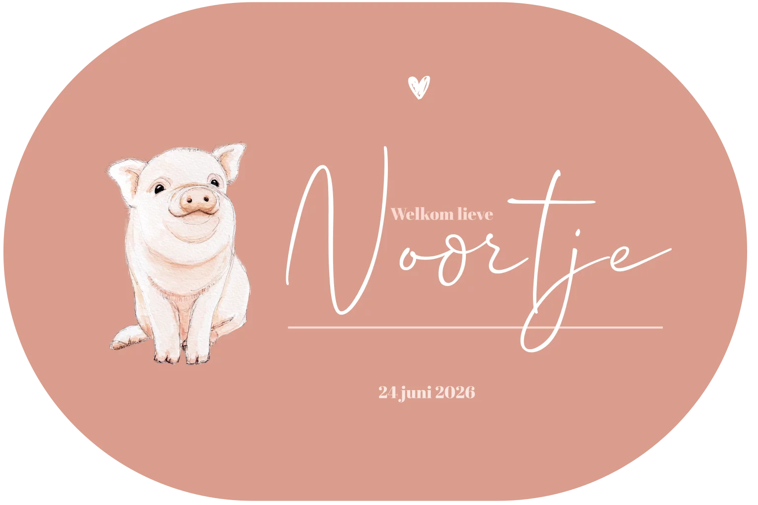 Schattig biggetje, met de hand getekend en afgewerkt met aquarel. Maak van dit koraal geboortekaartje in een bijzondere vorm door verschillende kleuren en lettertypes er je eigen ontwerp van.