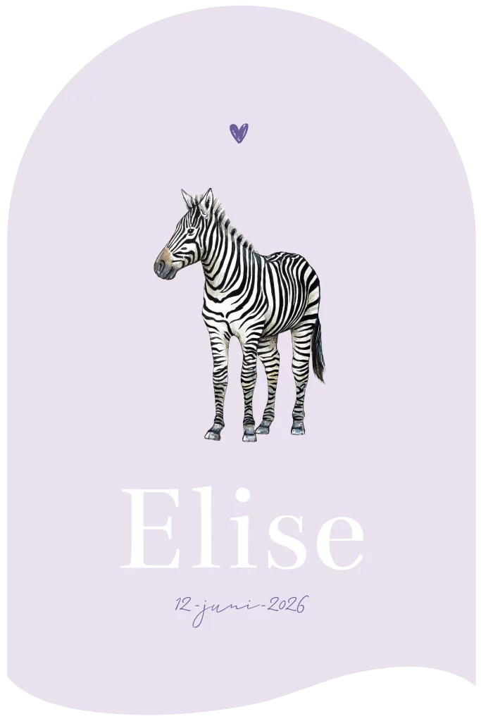 Schattige zebra, met de hand getekend en afgewerkt met aquarel. Maak van dit lila geboortekaartje in een bijzondere vorm door verschillende kleuren en lettertypes er je eigen ontwerp van.