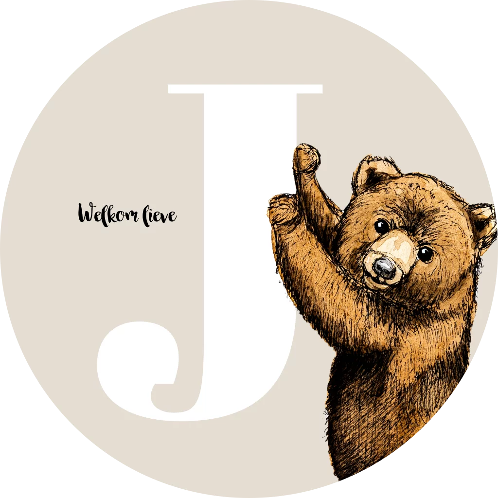 Rond geboortekaartje met een initiaal en illustratie van een baby beer, getekend door BINTJE. Dit kaartje kan je helemaal zelf aanpassen naar eigen wens.