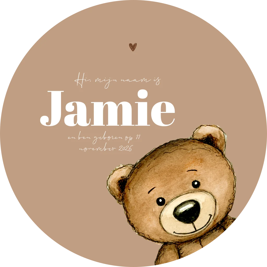 Rond geboortekaartje jongen met een illustratie van een schattige knuffel beer, getekend door BINTJE. Dit kaartje kan je helemaal zelf aanpassen naar eigen wens.