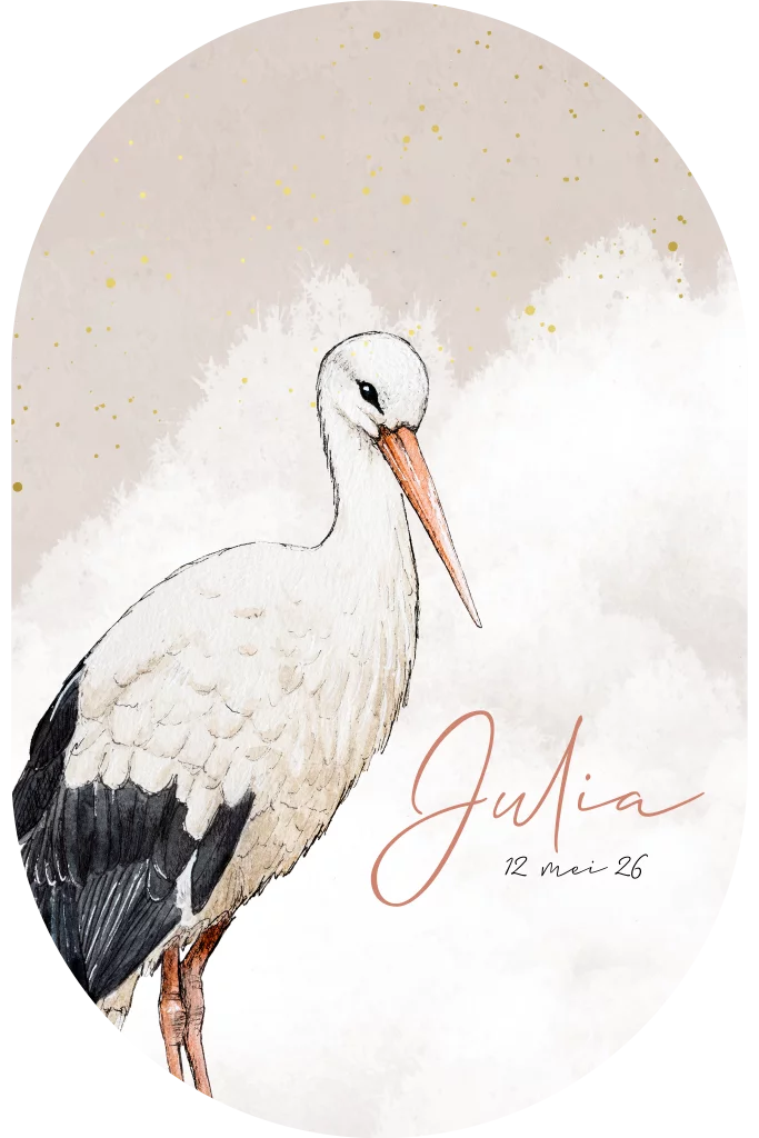 Dit dromerig, ovaal geboortekaartje heeft een schattige illustratie van de ooievaar, getekend door BINTJE. Dit kaartje is helemaal zelf aanpassen in de editor. Maak met andere kleuren, lettertypes of een ander diertje er je eigen geboortekaartje van.