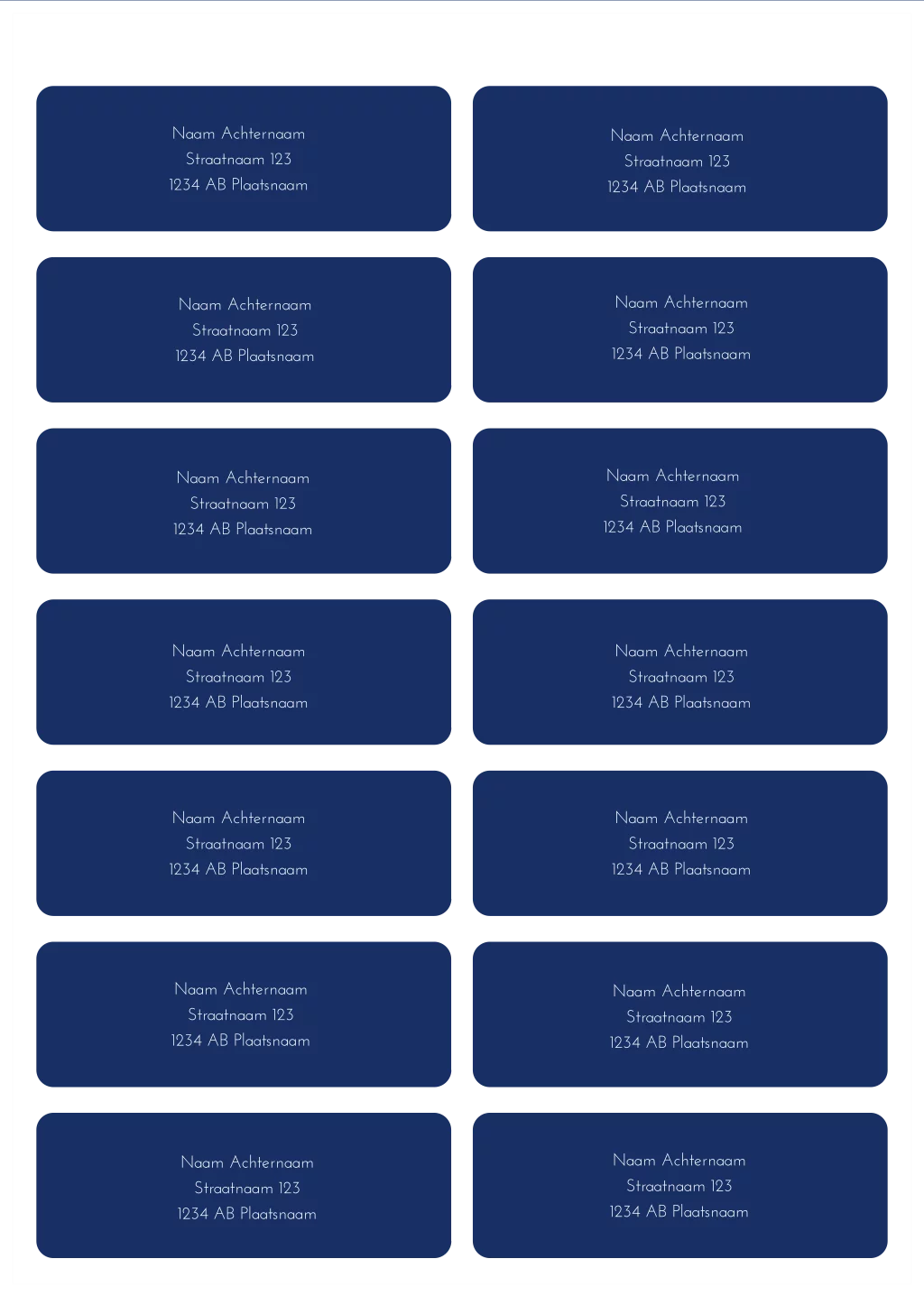 Wil je niet zelf je adressen schrijven? Dan kan je je adresstickers van te voren bestellen. TIP: ga voor een duidelijk lettertype en ga niet kleiner dan 3 punten.