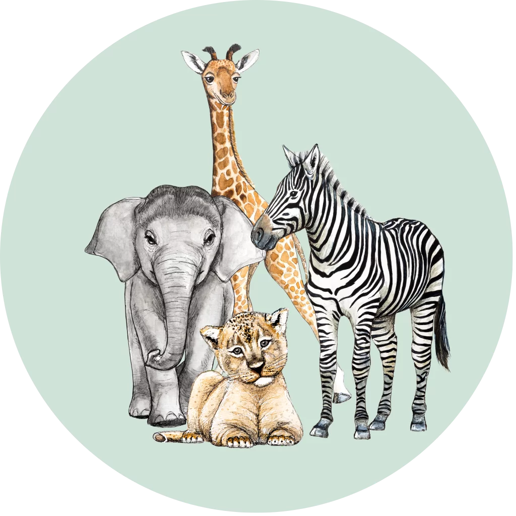 Behangcirkel met een illustratie van een groep dieren met een giraffe, zebra, baby leeuw en olifant, getekend door BINTJE.Deze behangcirkel heeft een doorsnede van 80cm en is helemaal naar eigen wens aan te passen