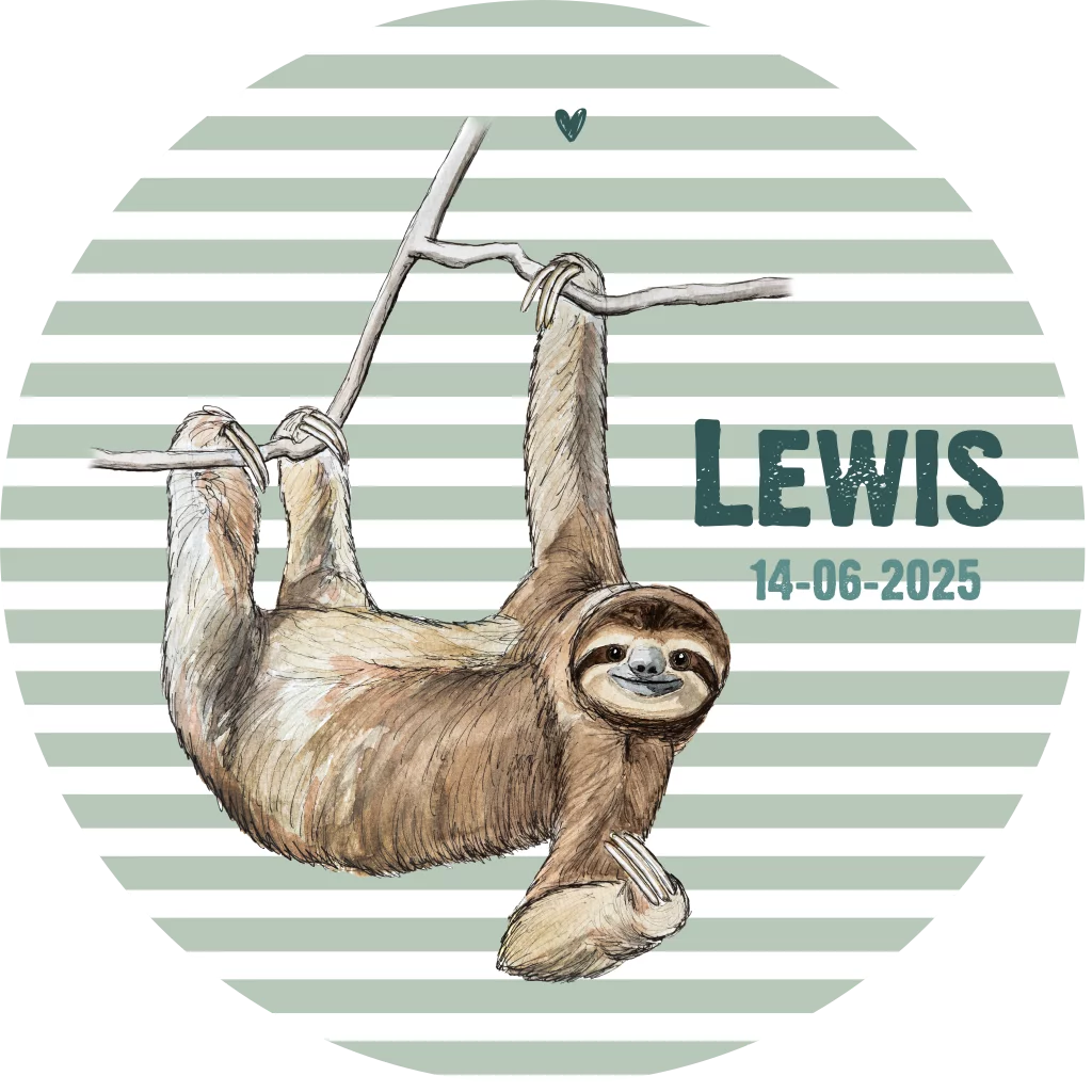 Behangcirkel met een illustratie van een luiaard, getekend door BINTJE. Deze behangcirkel is 80cm dDeze behangcirkel heeft een doorsnede van 80cm en is helemaal naar eigen wens aan te passen