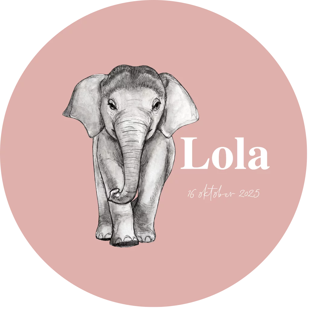 Roze behangcirkel met een illustratie van een baby olifant, getekend door BINTJE. Deze behangcirkel heeft een doorsnede van 80cm en is helemaal naar eigen wens aan te passen