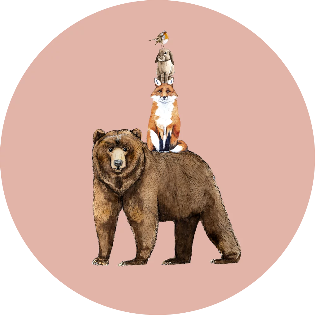 Behangcirkel met een illustratie van een stapel bosdieren met een roodborstje, konijn, vos en beer getekend door BINTJE. Deze behangcirkel heeft een doorsnede van 80cm en is helemaal naar eigen wens aan te passen
