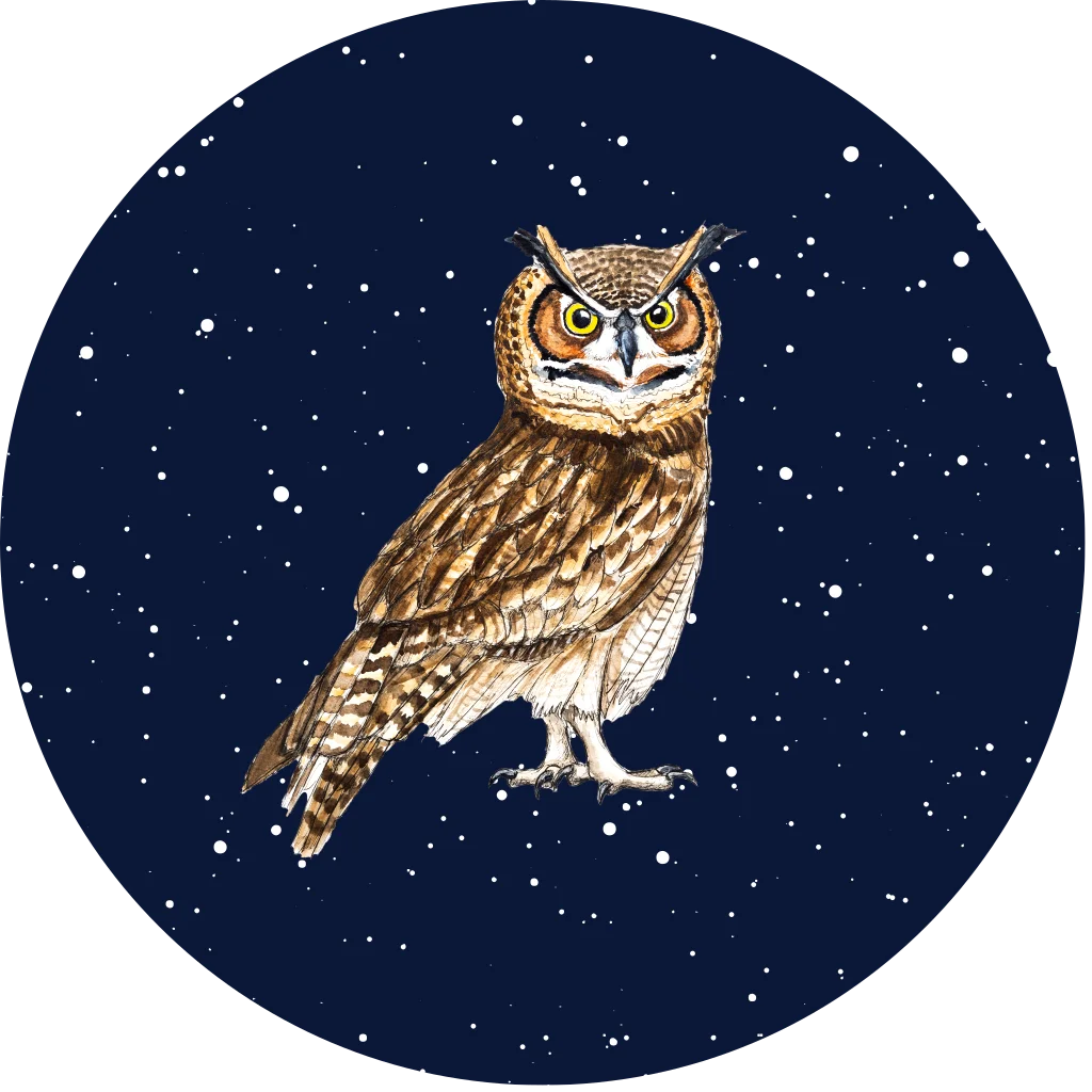 Behangcirkel met een illustratie van een uil in de nacht, getekend door BINTJE. Deze behangcirkel heeft een doorsnede van 80cm en is helemaal naar eigen wens aan te passen