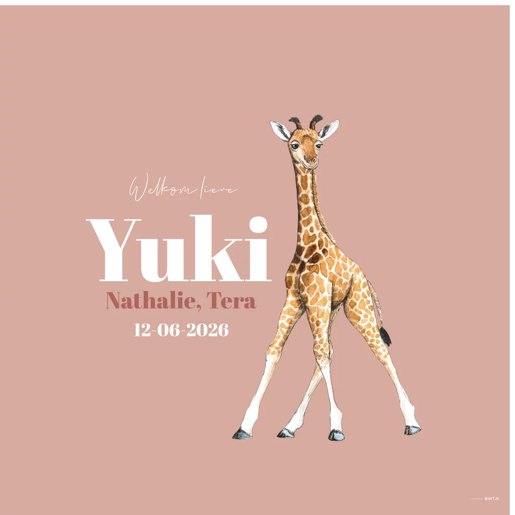 Raambord met baby giraf, met de hand getekend en afgewerkt met aquarel. Maak met verschillende kleuren, illustraties en lettertypes er je eigen raambord van.