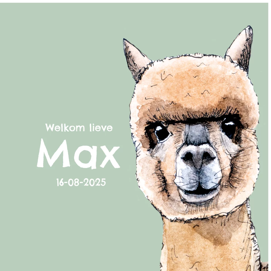 Raambord met alpaca, met de hand getekend en afgewerkt met aquarel. Maak met verschillende kleuren, illustraties en lettertypes er je eigen raambord van.