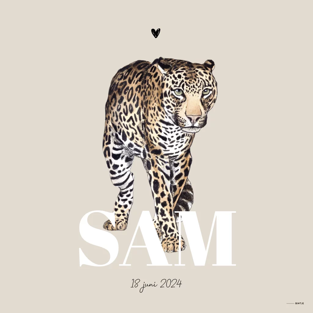 Tuinbord met een stoere luipaard, met de hand getekend en afgewerkt met aquarel. Maak door verschillende kleuren en lettertypes er je eigen tuinbord van.