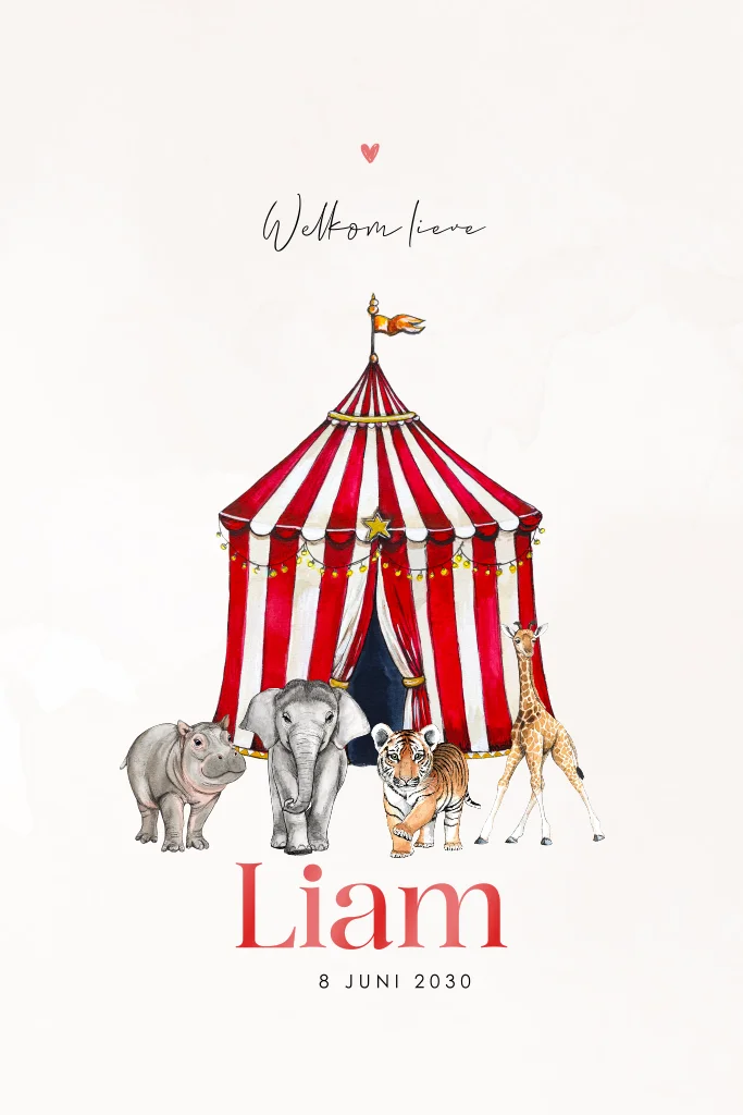 Zomers geboortekaartje met circustent met baby dieren en hoogglans kleur. Dit kaartje kan je helemaal zelf aanpassen naar eigen wens. Verander de kleuren of diertjes en maak er zo je eigen ontwerp van.