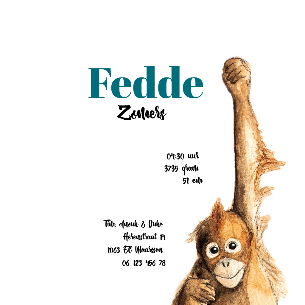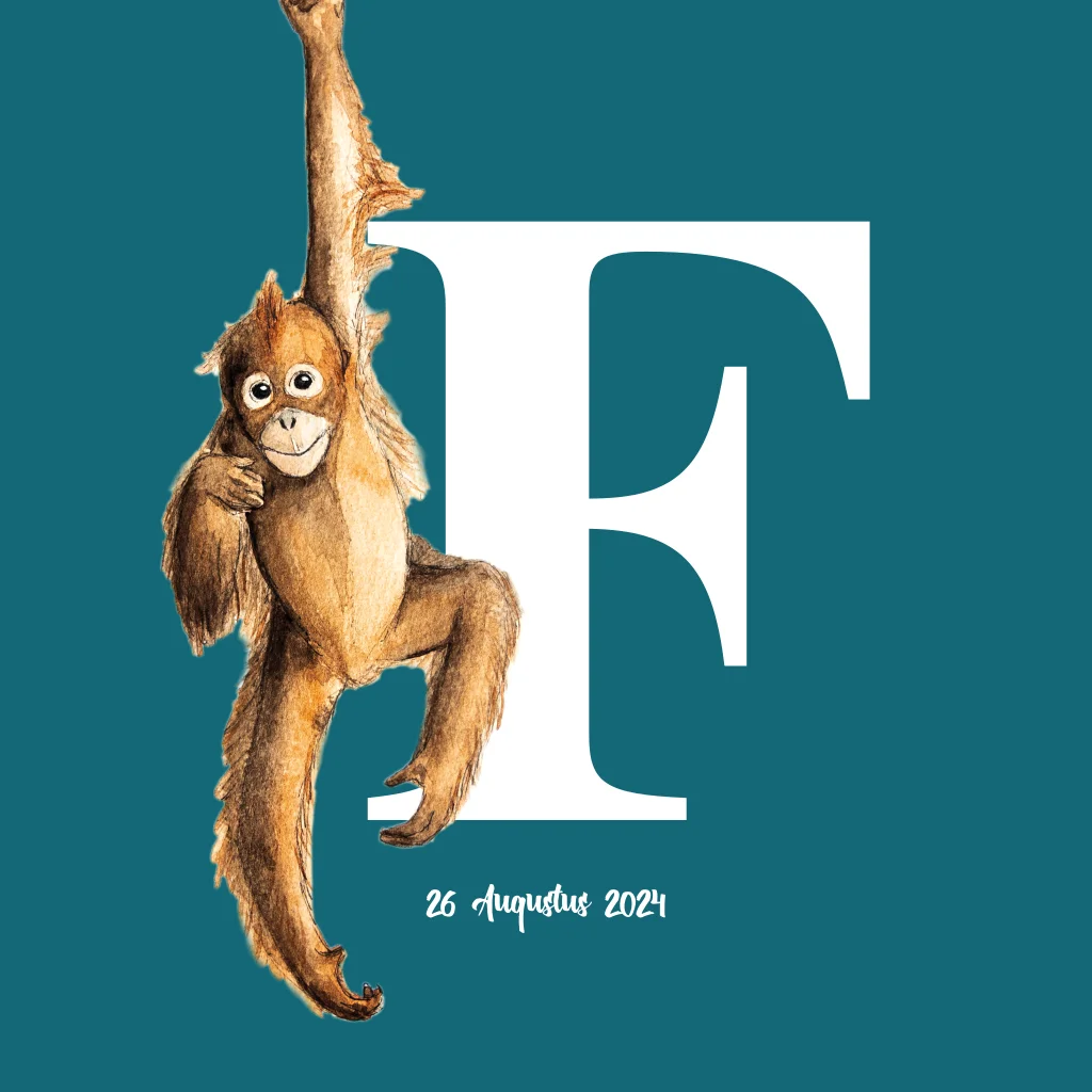 Lief aapje, met de hand getekend en afgewerkt met aquarel. Maak van dit geboortekaartje met petrol initiaal door verschillende kleuren en lettertypes er je eigen ontwerp van.