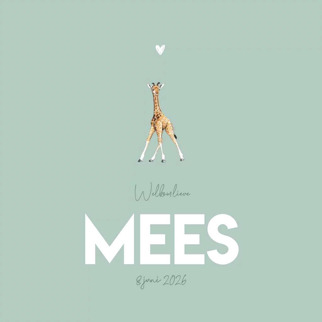 Schattig baby girafje, met de hand getekend en afgewerkt met aquarel en de naam in Regenboog folie. Maak van dit groene geboortekaartje met giraffe door verschillende kleuren en lettertypes er je eigen ontwerp van.