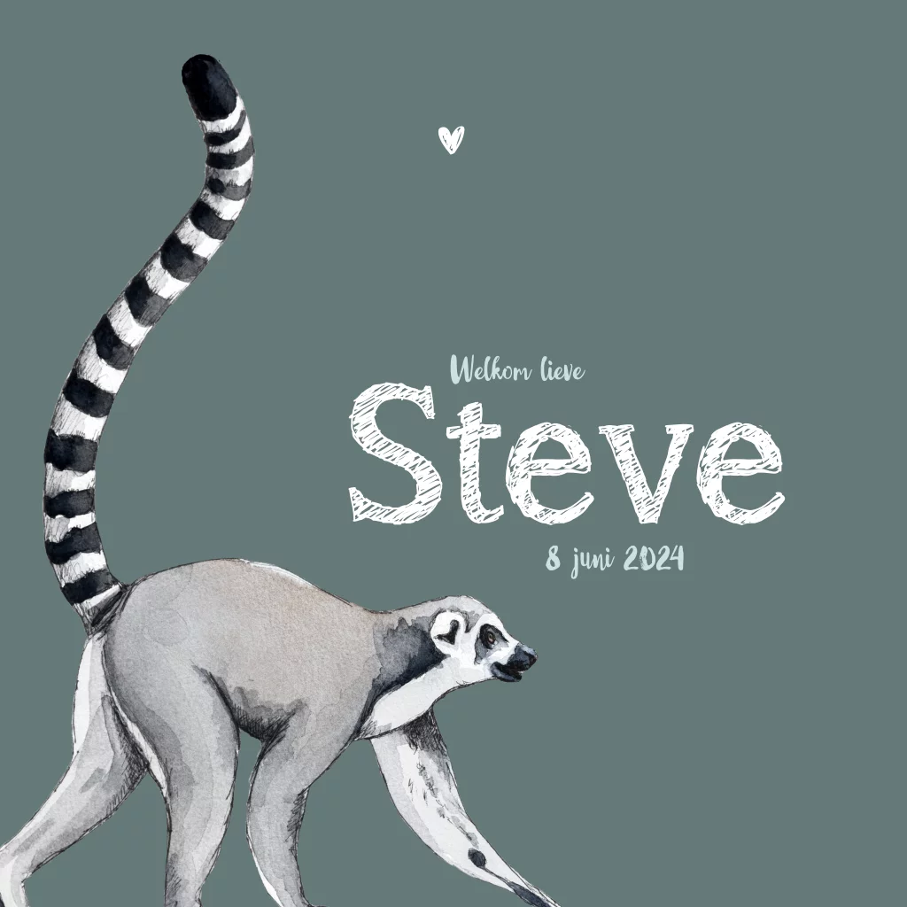 Stoere maki, met de hand getekend en afgewerkt met aquarel. Maak van dit geboortekaartje door verschillende kleuren en lettertypes er je eigen ontwerp van.