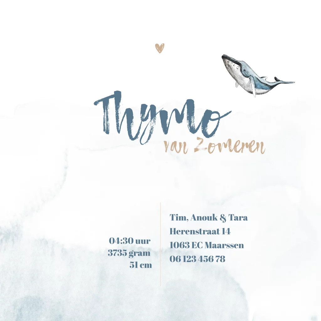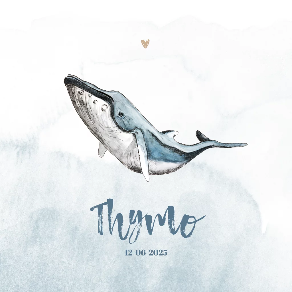 Stoere walvis, met de hand getekend en afgewerkt met aquarel. Maak van dit geboortekaartje door verschillende kleuren en lettertypes er je eigen ontwerp van.