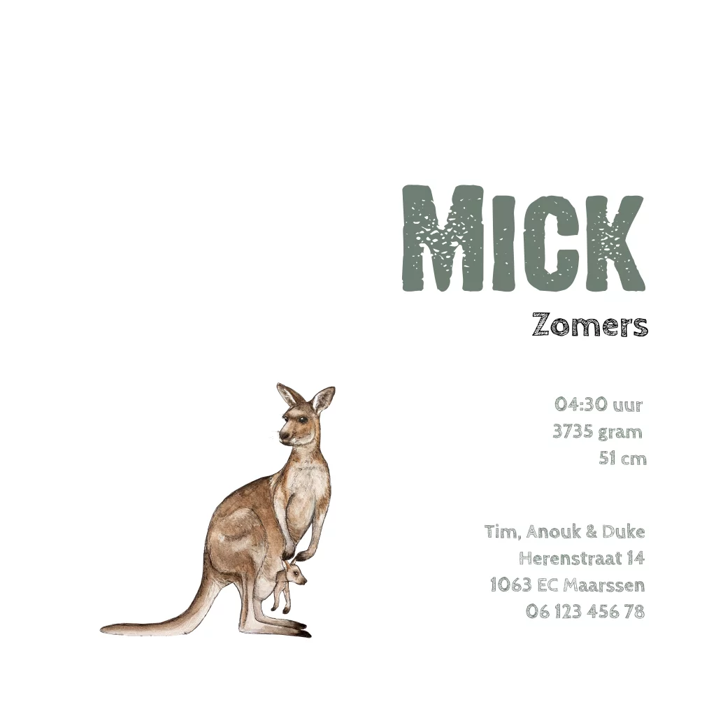 Lieve kangoeroe met baby, met de hand getekend en afgewerkt met aquarel. Maak van dit geboortekaartje door verschillende kleuren en lettertypes er je eigen ontwerp van.