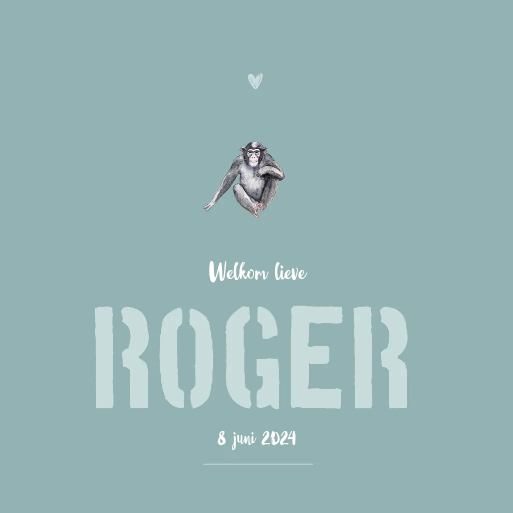 Stoere aap, met de hand getekend en afgewerkt met aquarel. Maak van dit geboortekaartje door verschillende kleuren en lettertypes er je eigen ontwerp van.