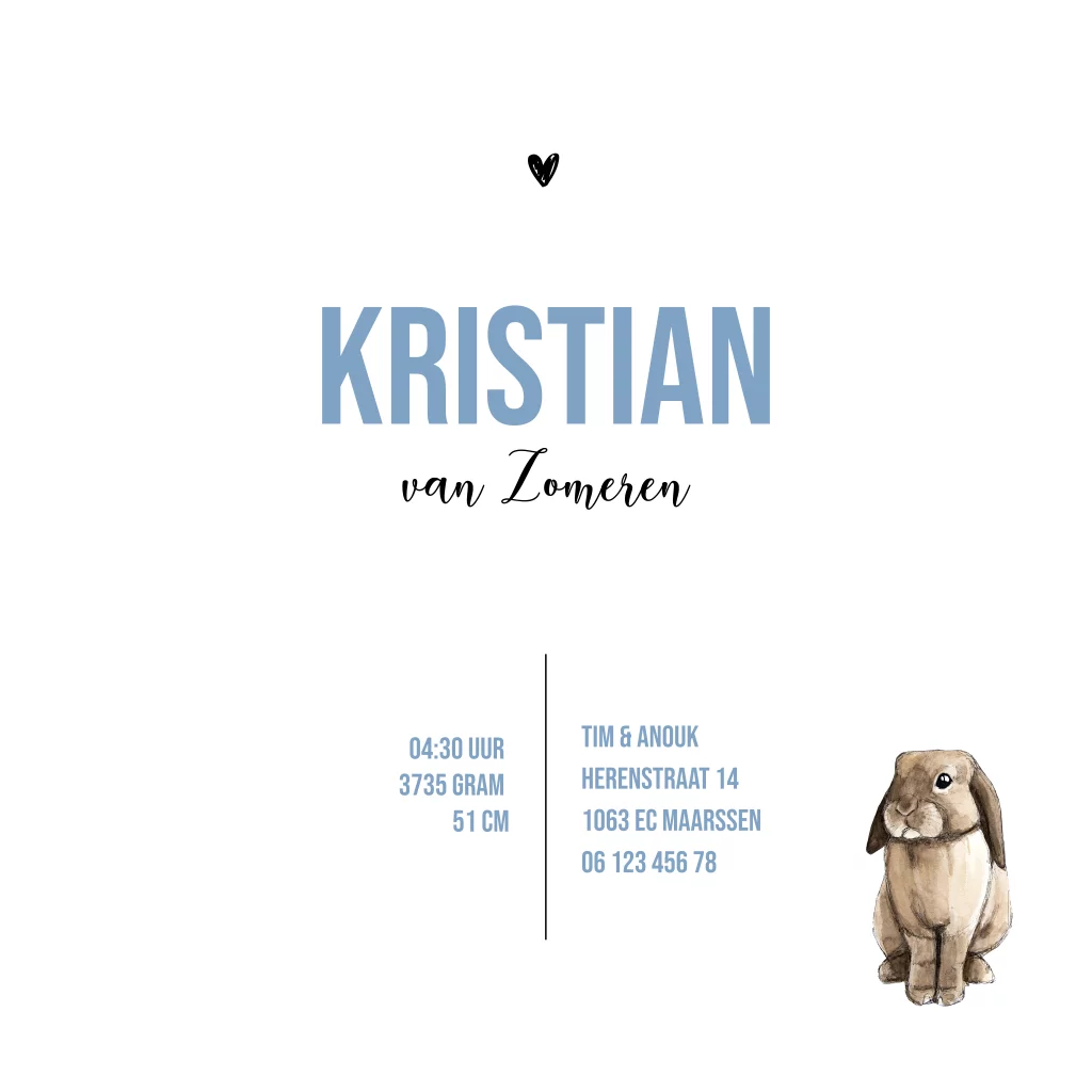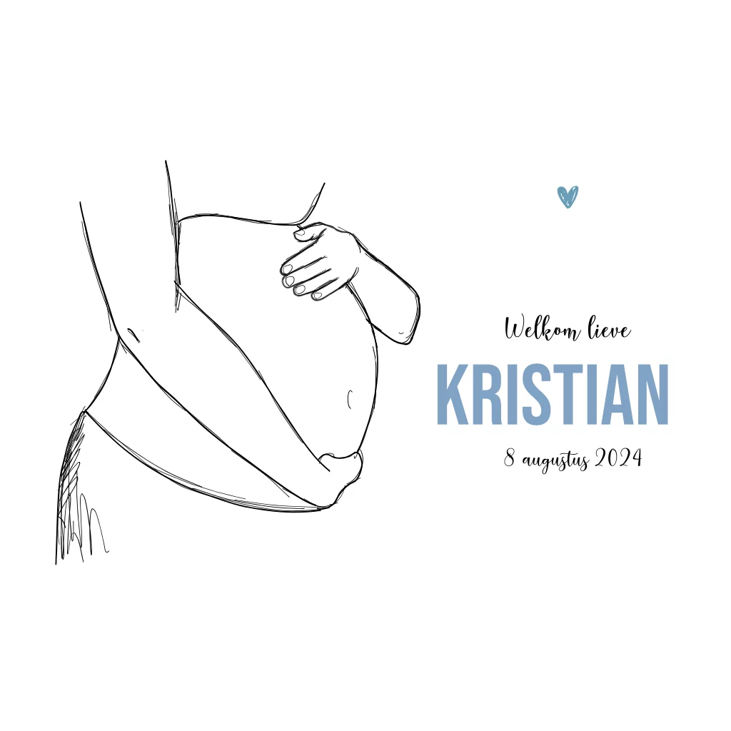 Staand vierkant geboortekaartje voor een jongen met een illustratie van een zwangere buik getekend door BINTJE. Dit kaartje kan je helemaal zelf aanpassen naar eigen wens.