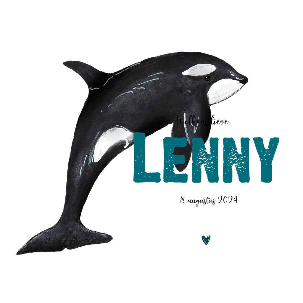 Lieve orka, met de hand getekend en afgewerkt met aquarel. Maak van dit geboortekaartje door verschillende kleuren en lettertypes er je eigen ontwerp van.