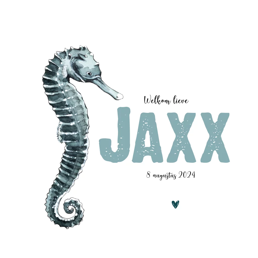 Lief Zeepaardje, met de hand getekend en afgewerkt met aquarel. Maak van dit geboortekaartje door verschillende kleuren en lettertypes er je eigen ontwerp van.