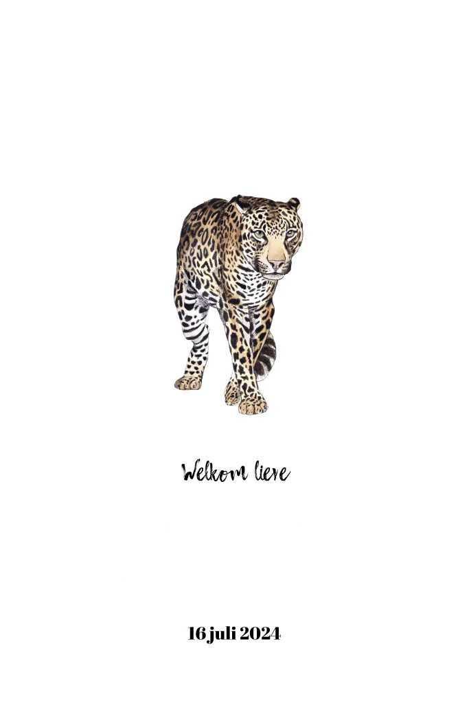 Stoere luipaard, met de hand getekend en afgewerkt met aquarel. Maak van dit geboortekaartje door verschillende kleuren en lettertypes er je eigen ontwerp van.
