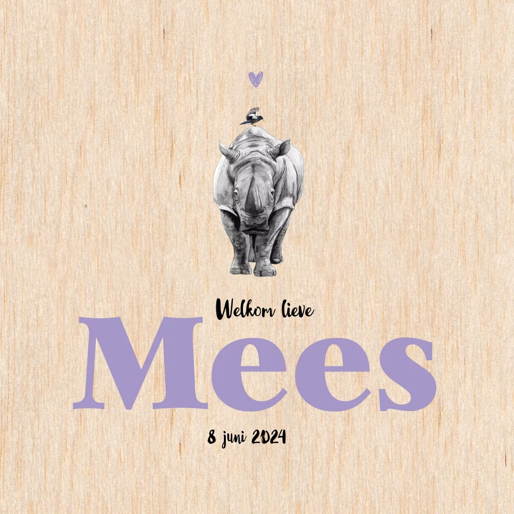 Stoere neushoorn, met de hand getekend en afgewerkt met aquarel. Maak van dit geboortekaartje door verschillende kleuren en lettertypes er je eigen ontwerp van.