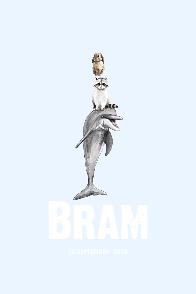 Stapel dieren, met de hand getekend en afgewerkt met aquarel. Maak van dit blauwe geboortekaartje door verschillende kleuren en lettertypes er je eigen ontwerp van. Bestaande uit de dolfijn, wasbeer, konijn.