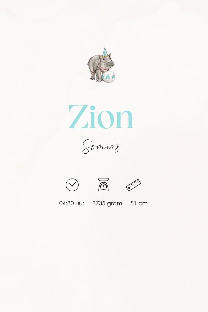 Hoe schattig is dit geboortekaartje met baby nijlpaard met circus bal. Je kunt het geboortekaartje helemaal naar eigen wens aanpassen. Zo wordt het je eigen persoonlijke geboortekaartje.