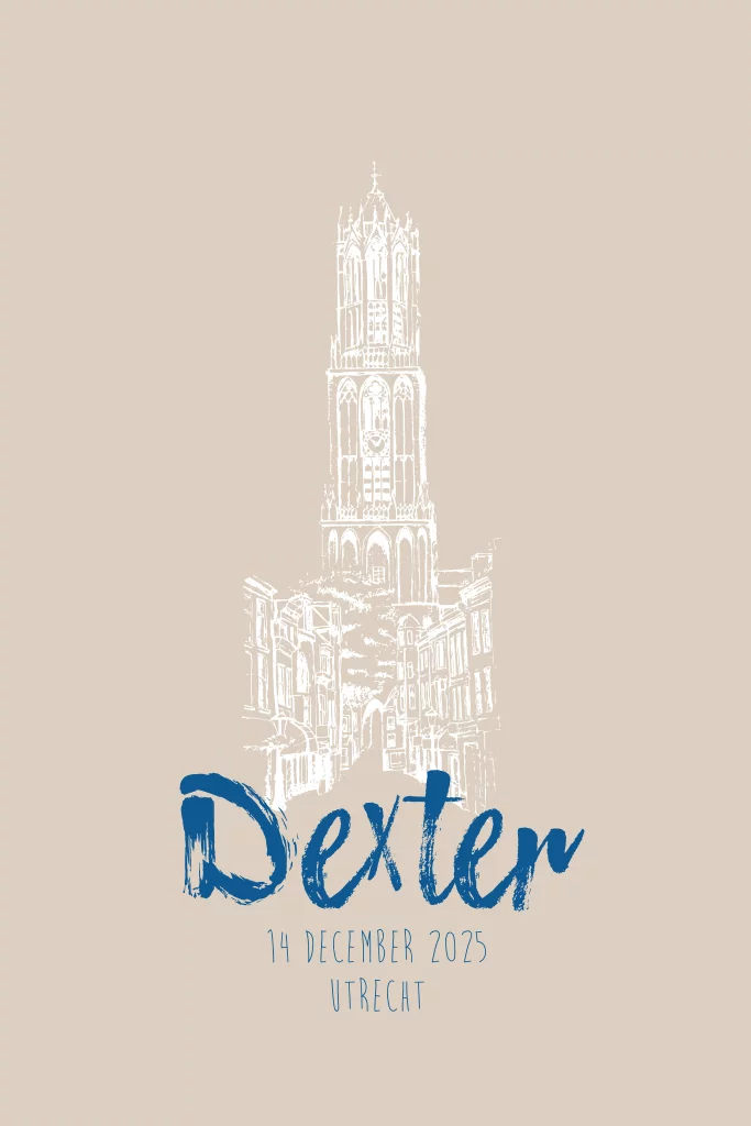 Geboortekaartje jongen met een tekening van de domtoren van Utrecht, met de hand getekend. Maak van dit geboortekaartje door verschillende kleuren en lettertypes er je eigen ontwerp van.