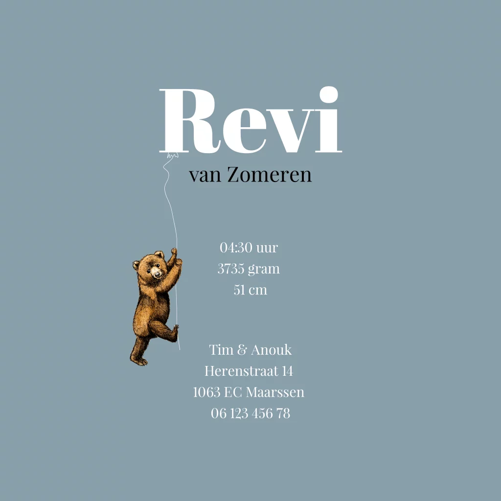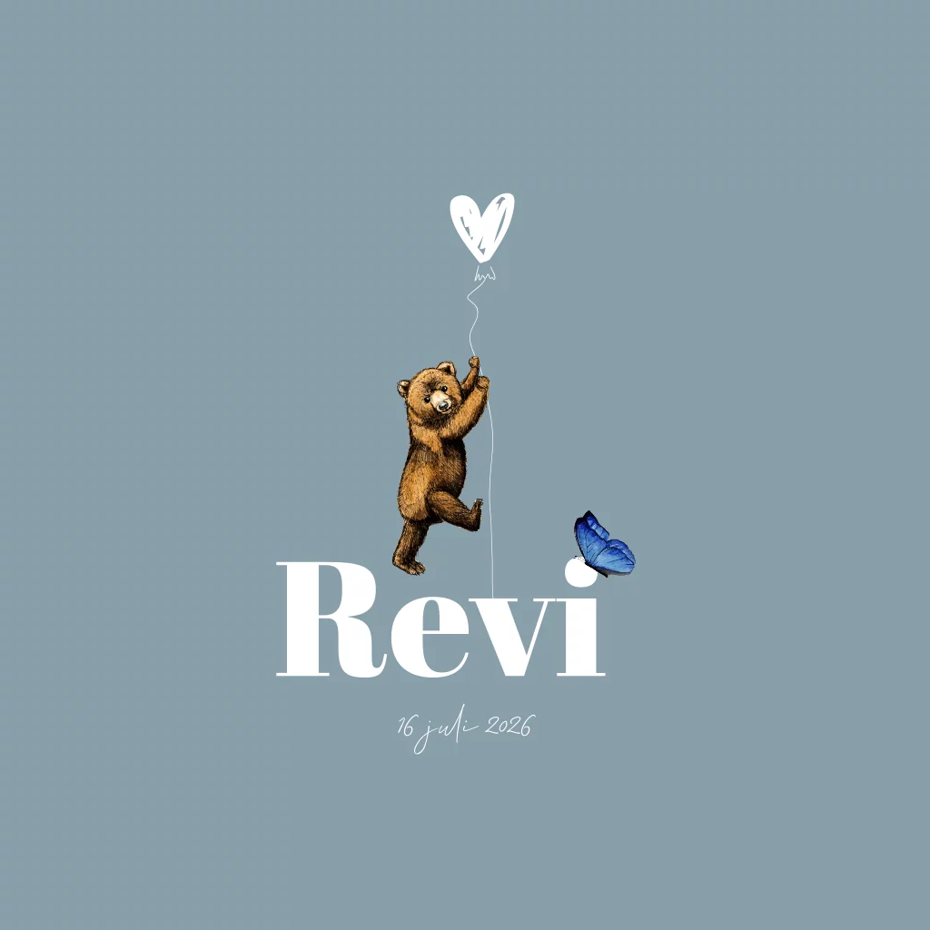 Geboortekaartje blauw met baby beer en vlinder, met de hand getekend en afgewerkt met aquarel. Maak van dit geboortekaartje, met verschillende kleuren en lettertypes er je eigen geboortekaartje van.