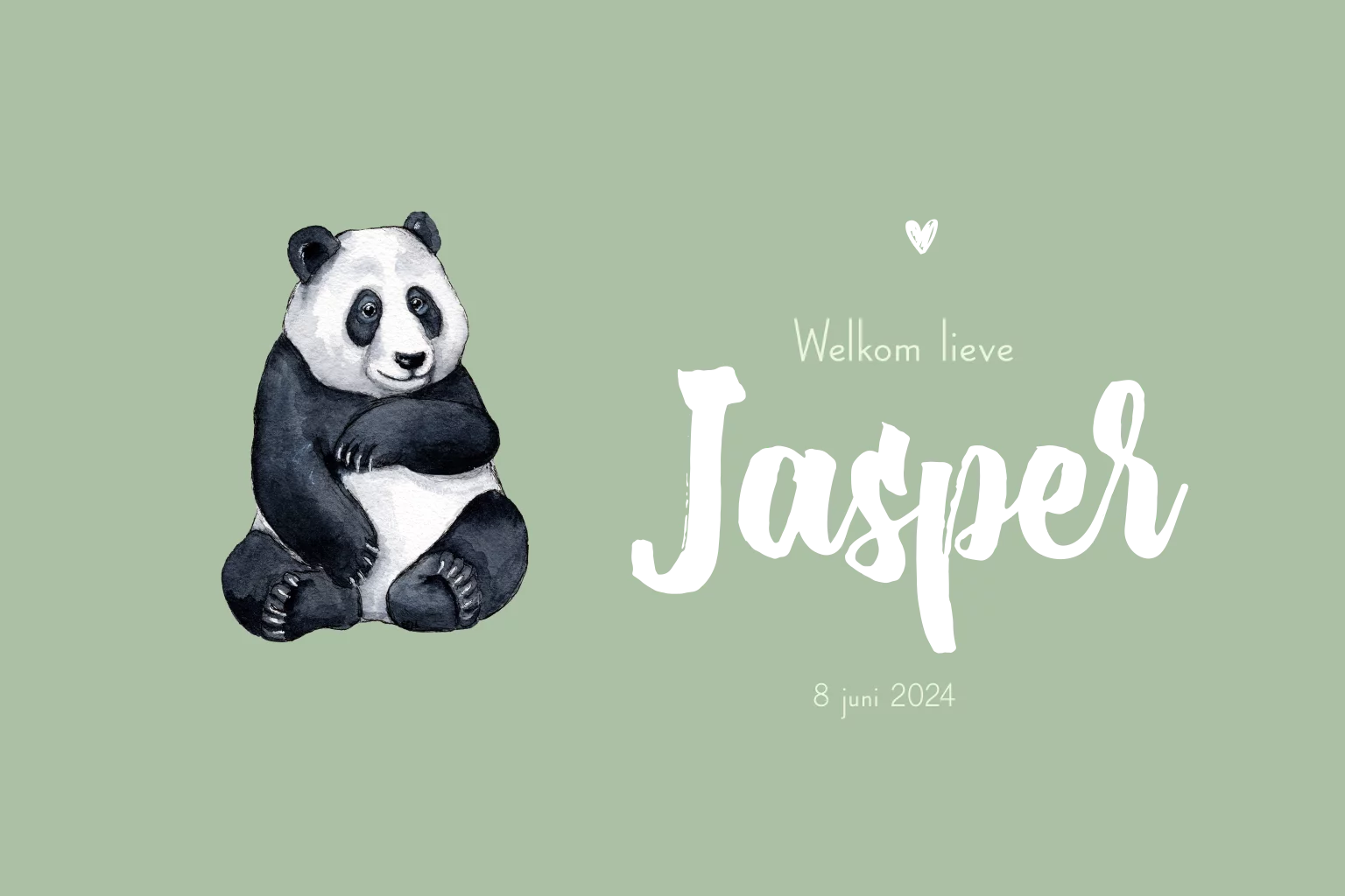 Lieve panda, met de hand getekend en afgewerkt met aquarel. Maak van dit groene geboortekaartje met goudfolie door verschillende kleuren en lettertypes er je eigen ontwerp van.