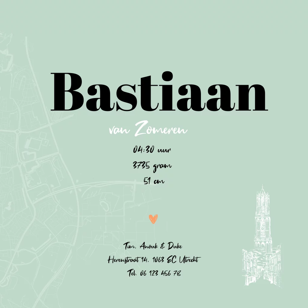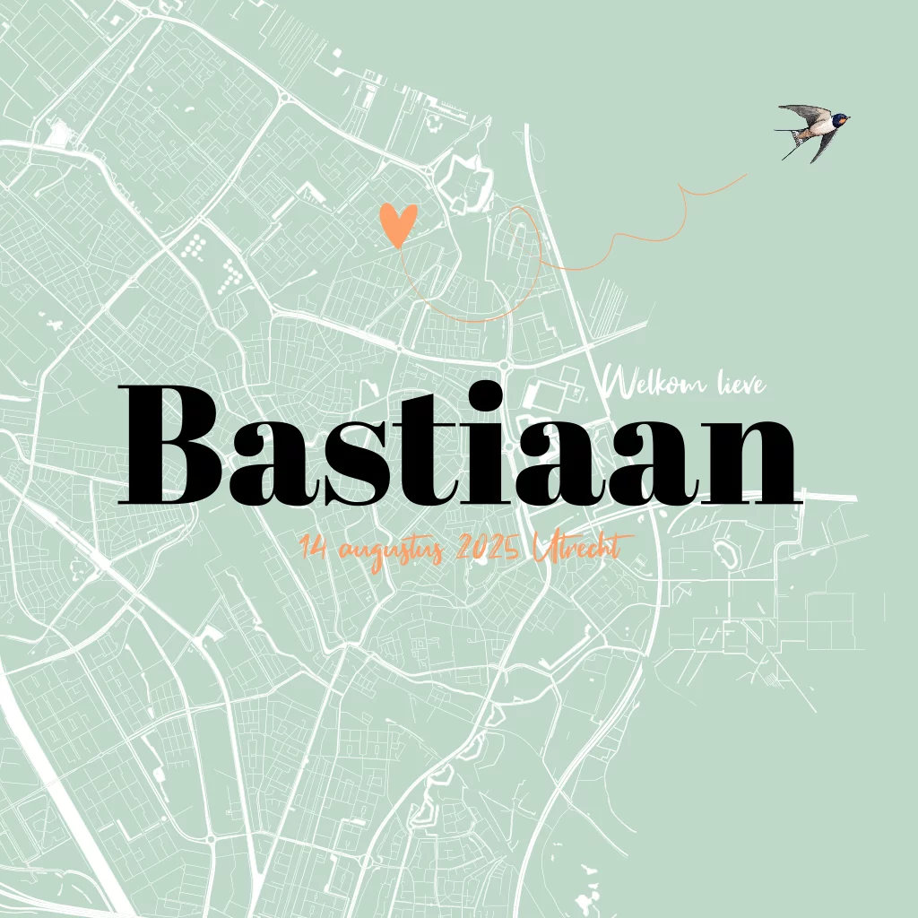 Geboortekaartje jongen met de plattegrond van Utrecht met een een illustratie van een zwaluw getekend door BINTJE. Dit kaartje kan je helemaal zelf aanpassen naar eigen wens. Wil je graag een plattegrond van een andere stad of dorp? Mail voor jouw stad.