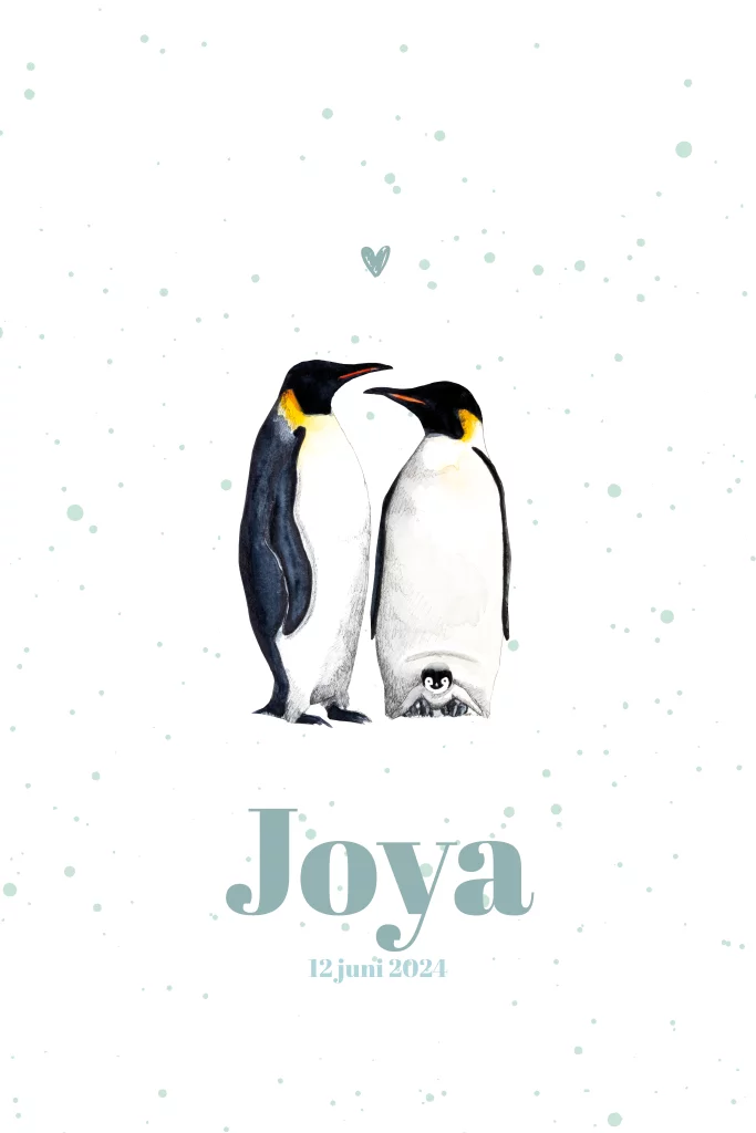 Lief winter geboortekaartje voor een jongen met sneeuw en pinguins. De illustratie met de hand getekend en afgewerkt met aquarel. Maak van dit staand, beige geboortekaartje door verschillende kleuren en lettertypes er je eigen ontwerp van.