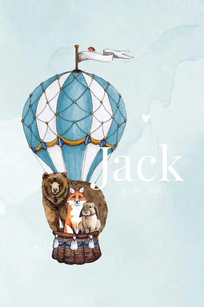 Staand geboortekaartje met een luchtballon met diertjes. Het geboortekaartje kan je helemaal zelf aanpassen. Maak met andere kleuren, lettertypes of een ander diertje er je eigen geboortekaartje van.