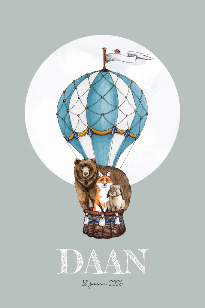 Staand geboortekaartje met luchtballon vol bosdieren dieren. Het geboortekaartje kan je helemaal zelf aanpassen in de editor. Maak met andere kleuren, lettertypes of een ander diertje er je eigen geboortekaartje van.