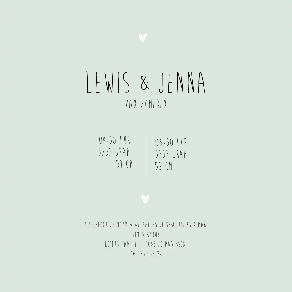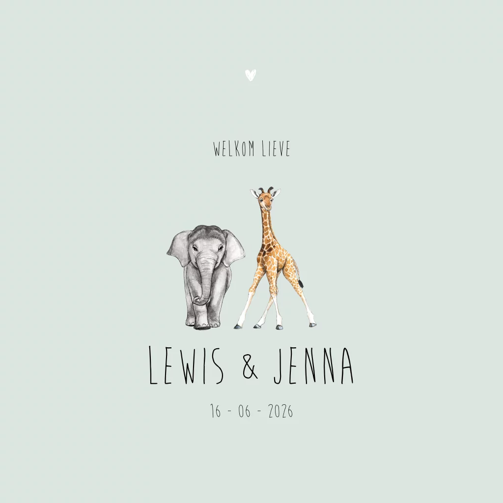 Geboortekaartje tweeling met een giraf en olifant, met de hand getekend en afgewerkt met aquarel. Maak van dit geboortekaartje, met verschillende kleuren en lettertypes er je eigen geboortekaartje van.