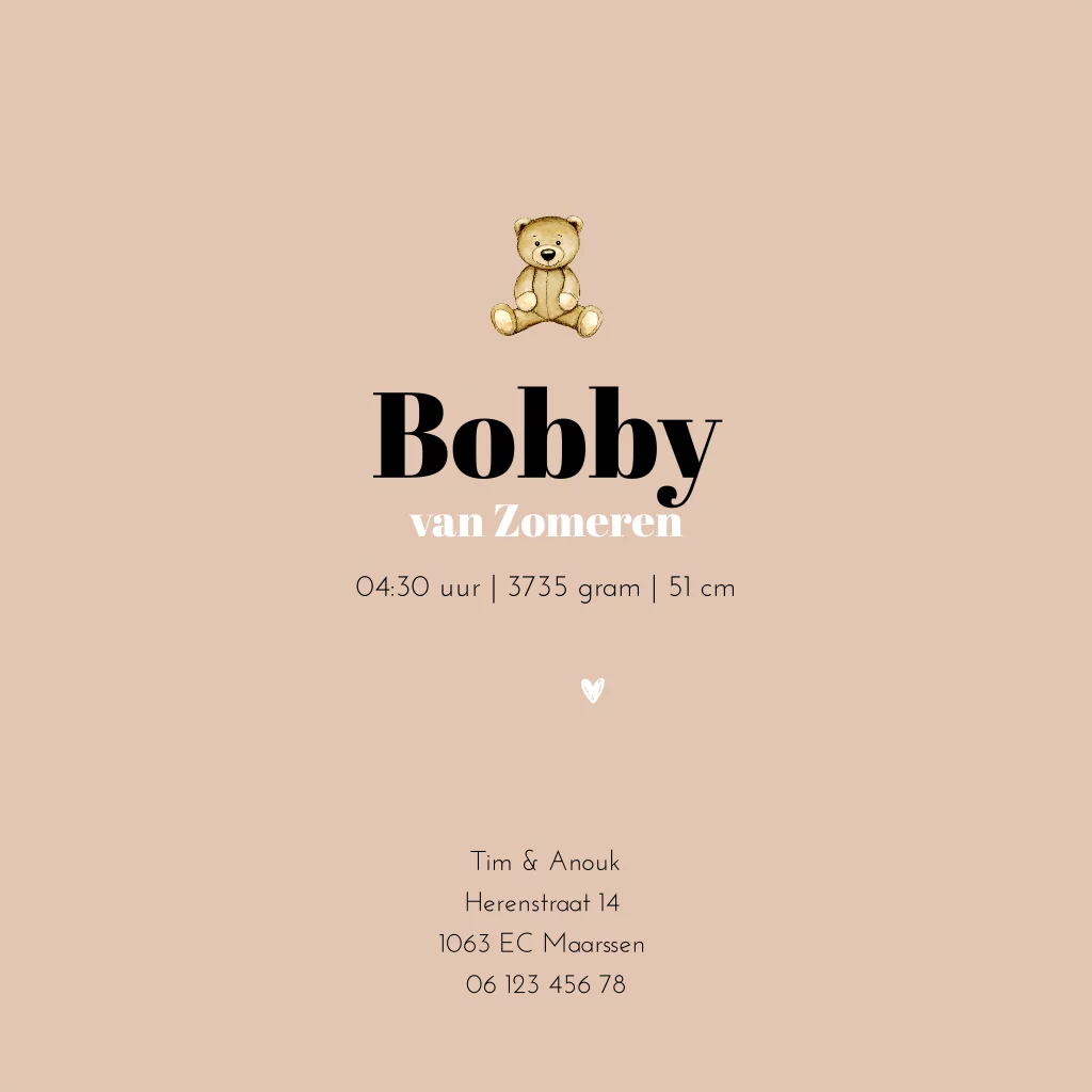 Geboortekaartje met een schattig teddybeertje, met de hand getekend en afgewerkt met aquarel. Maak van dit geboortekaartje, met verschillende kleuren en lettertypes er je eigen geboortekaartje van. Je kan de folie ook vervangen voor een andere kleur folie.