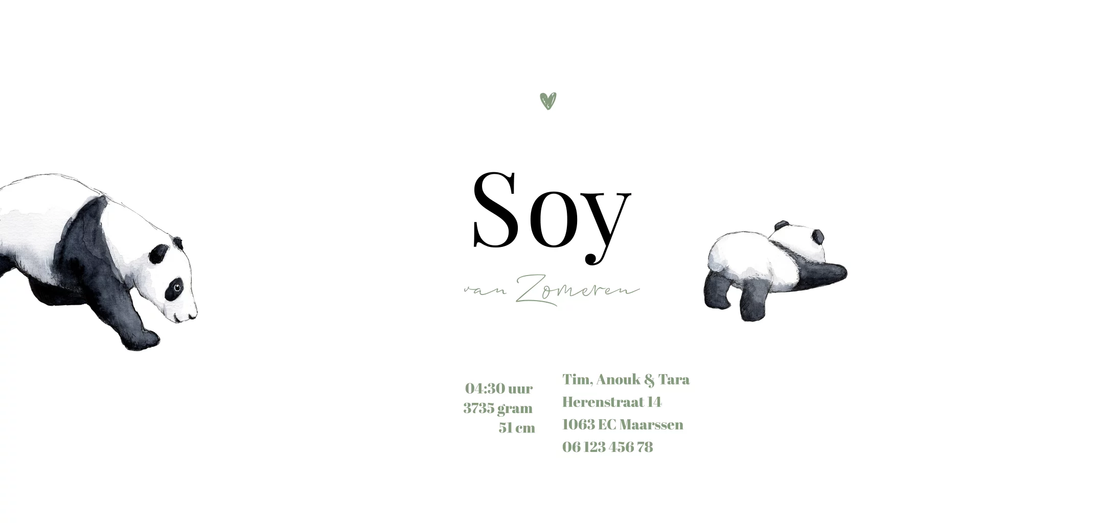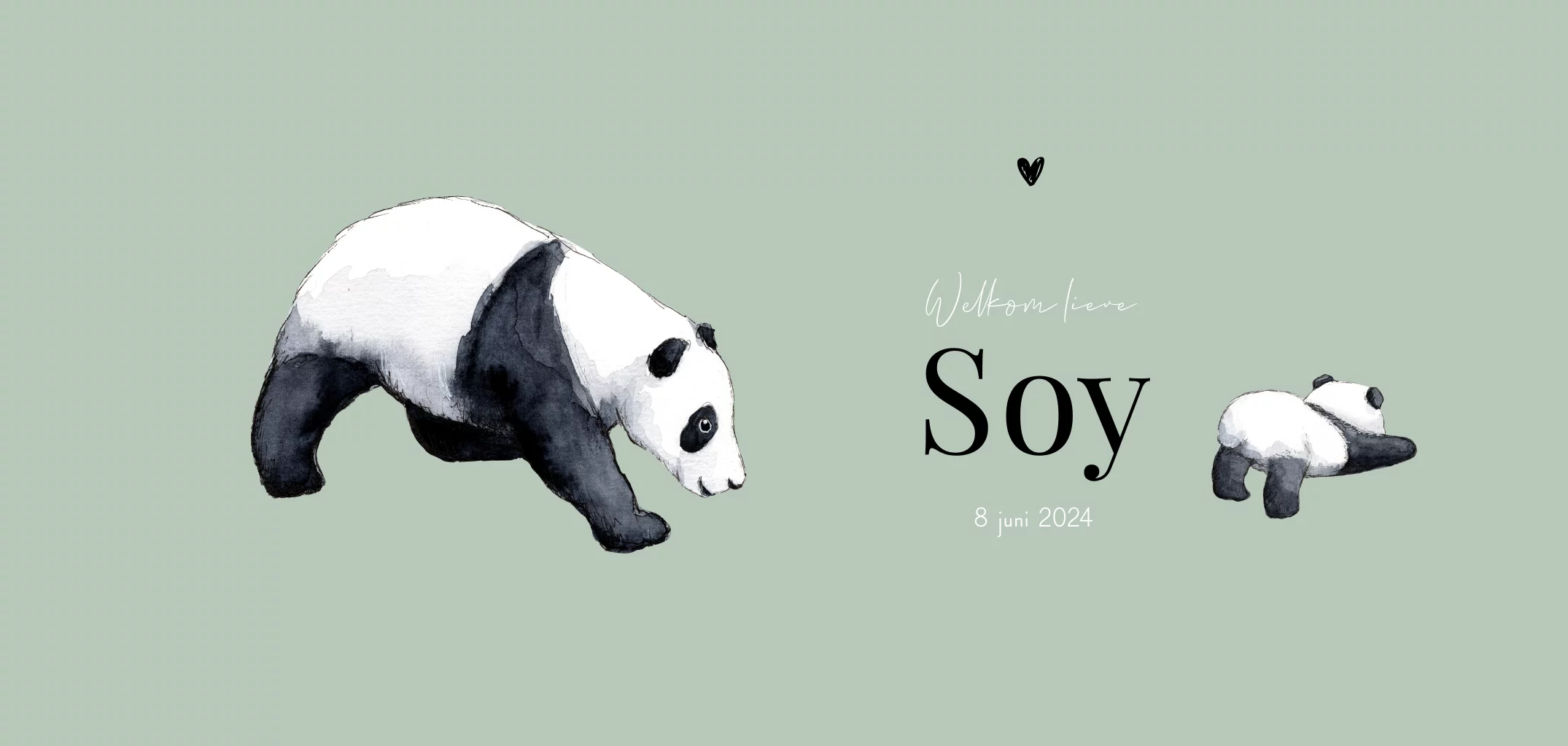 Groen geboortekaartje met een lieve panda, met de hand getekend en afgewerkt met aquarel. Maak van dit geboortekaartje door verschillende kleuren en lettertypes er je eigen ontwerp van.