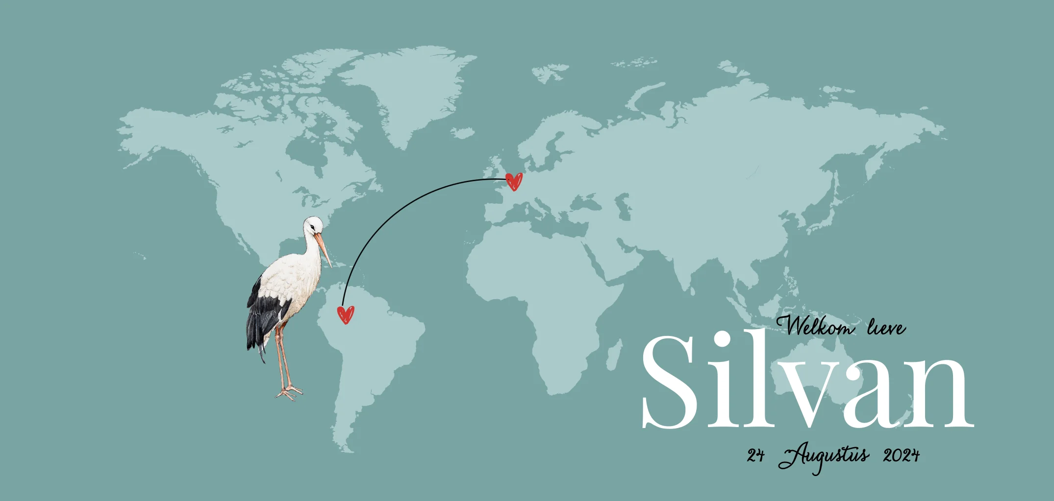Mooi geboortekaartje met een wereldkaart en een ooievaar. Deze is met de hand getekend en afgewerkt met aquarel. Maak van dit geboortekaartje door verschillende kleuren en lettertypes er je eigen ontwerp van.