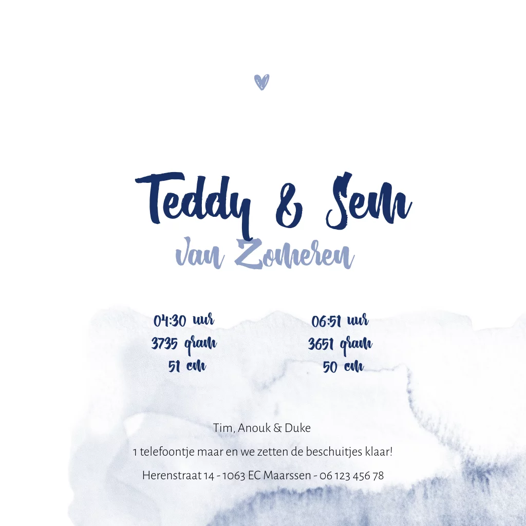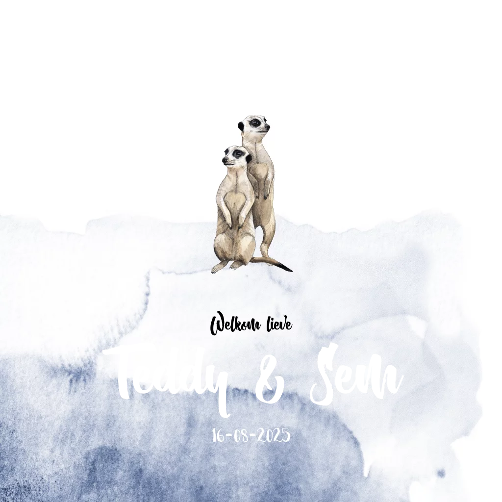Geboortekaartje met tweeling stokstaartjes, met de hand getekend en afgewerkt met aquarel. Maak van dit geboortekaartje door verschillende kleuren en lettertypes er je eigen ontwerp van.
