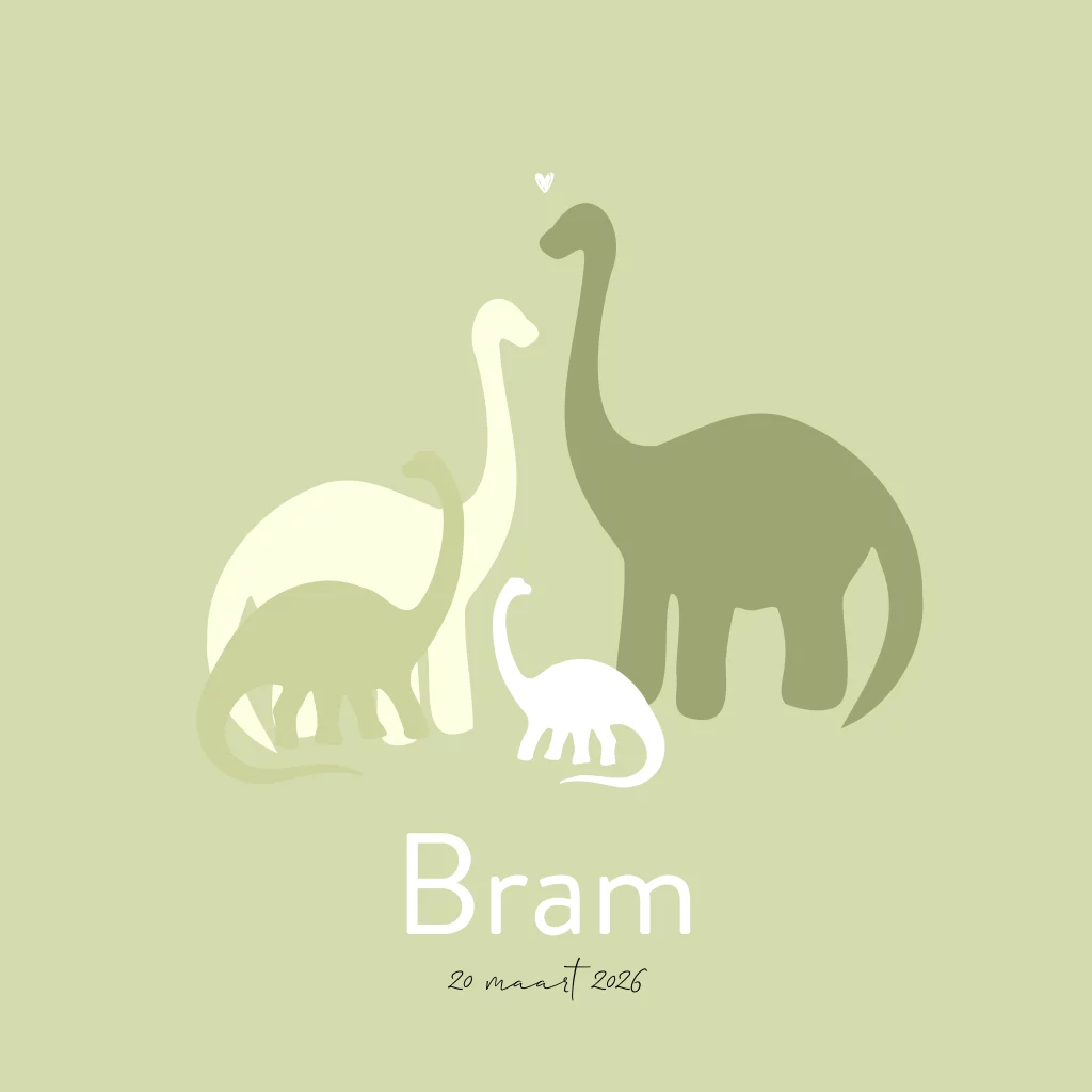 Vierkant geboortekaartje met een silhouet van een dino's. Het geboortekaartje helemaal zelf aanpassen in de editor. Maak met andere kleuren, lettertypes of een ander diertje er je eigen geboortekaartje van.