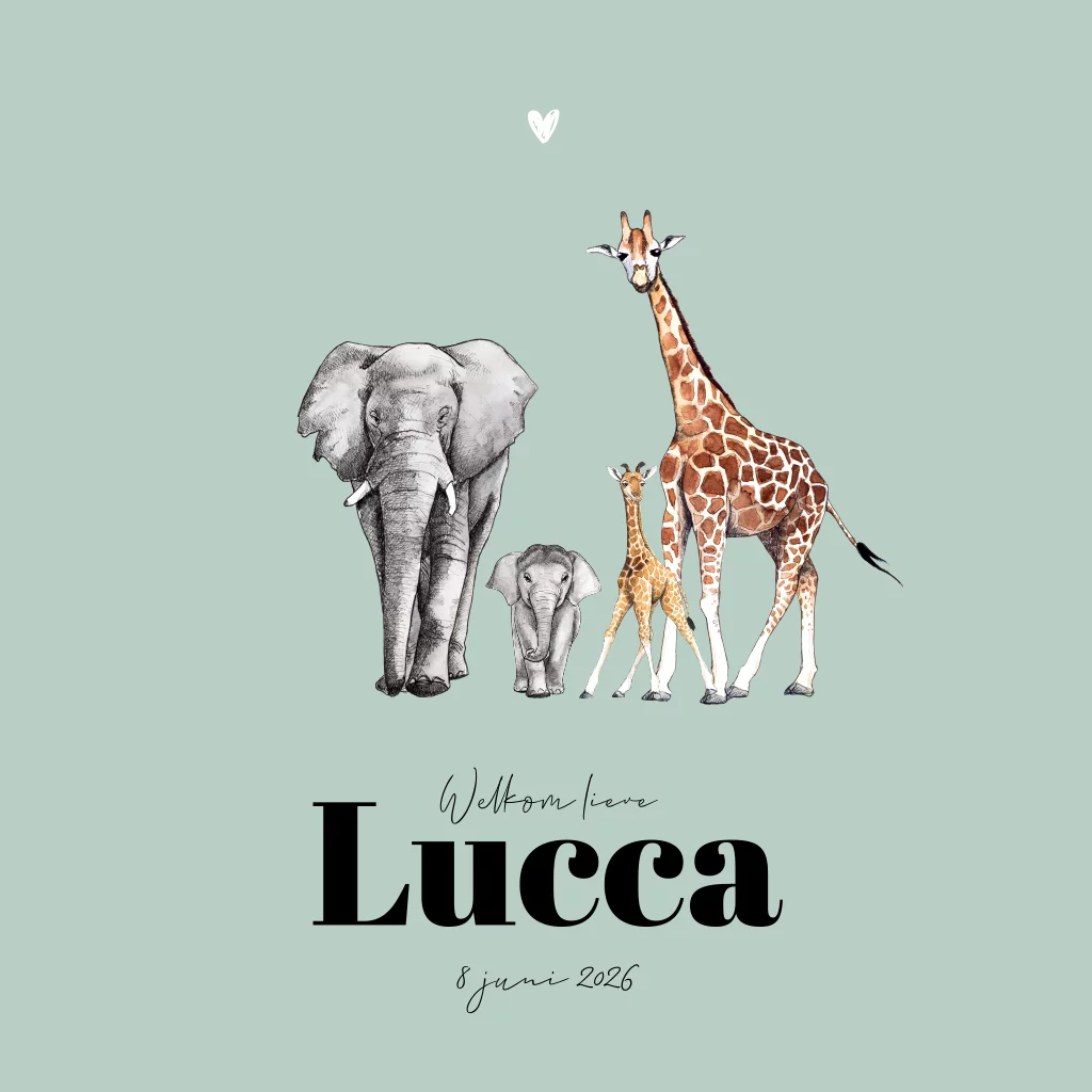 Vierkant geboortekaartje met famillie olifant en giraffe met de hand getekend en afgewerkt met aquarel. Maak van dit geboortekaartje met broertje / zusje door verschillende kleuren en lettertypes er je eigen ontwerp van.