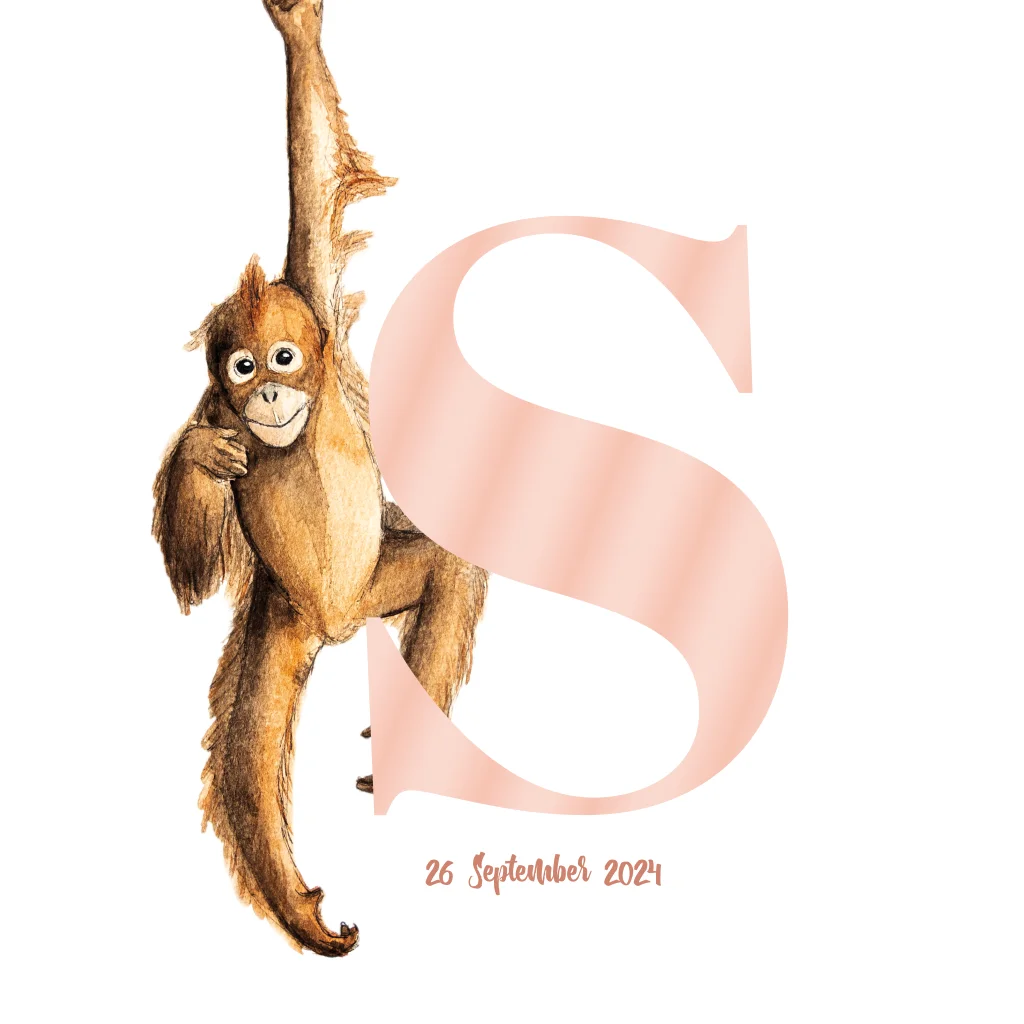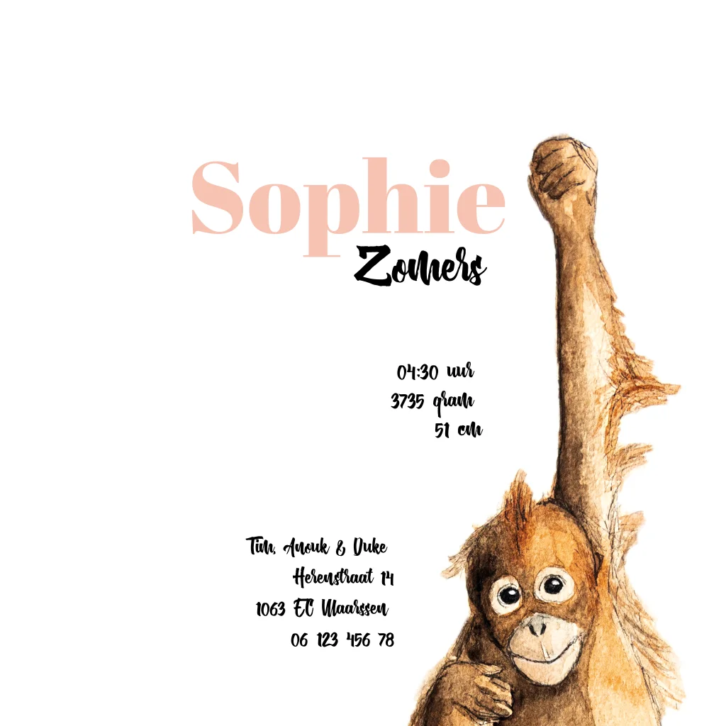 Lief hangend aapje, met de hand getekend en afgewerkt met aquarel en hoogglans lak. Maak van dit geboortekaartje door verschillende kleuren en lettertypes er je eigen ontwerp van.