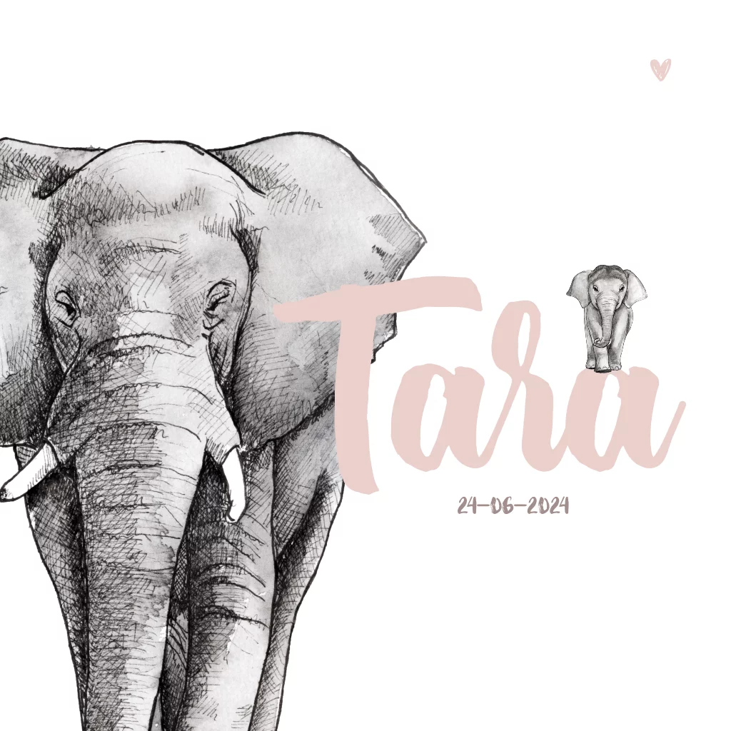 Stoere olifant met baby olifant, met de hand getekend en afgewerkt met aquarel. Maak van dit geboortekaartje door verschillende kleuren en lettertypes er je eigen ontwerp van.