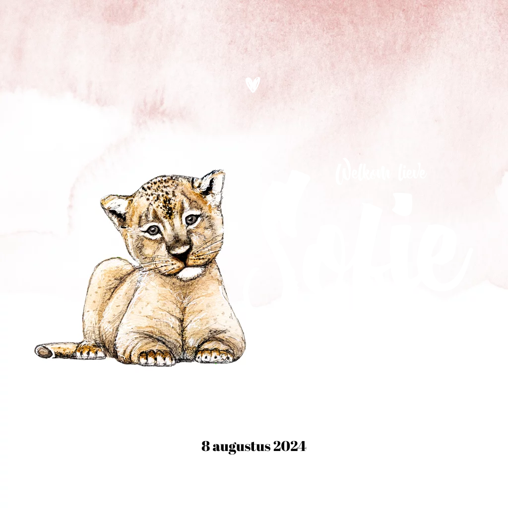 Schattig leeuwen welpje, met de hand getekend en afgewerkt met aquarel. Maak van dit geboortekaartje door verschillende kleuren en lettertypes er je eigen ontwerp van.