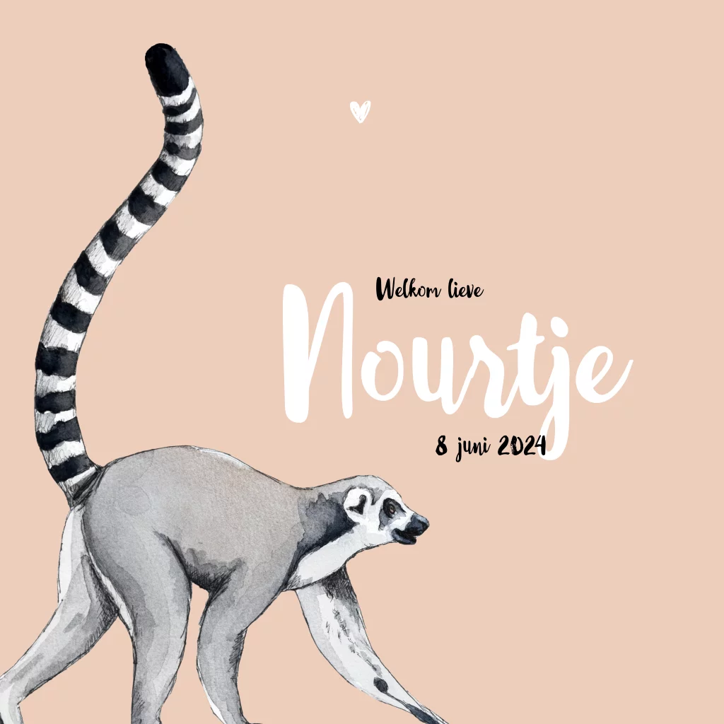 Stoere maki, met de hand getekend en afgewerkt met aquarel. Maak van dit geboortekaartje door verschillende kleuren en lettertypes er je eigen ontwerp van.