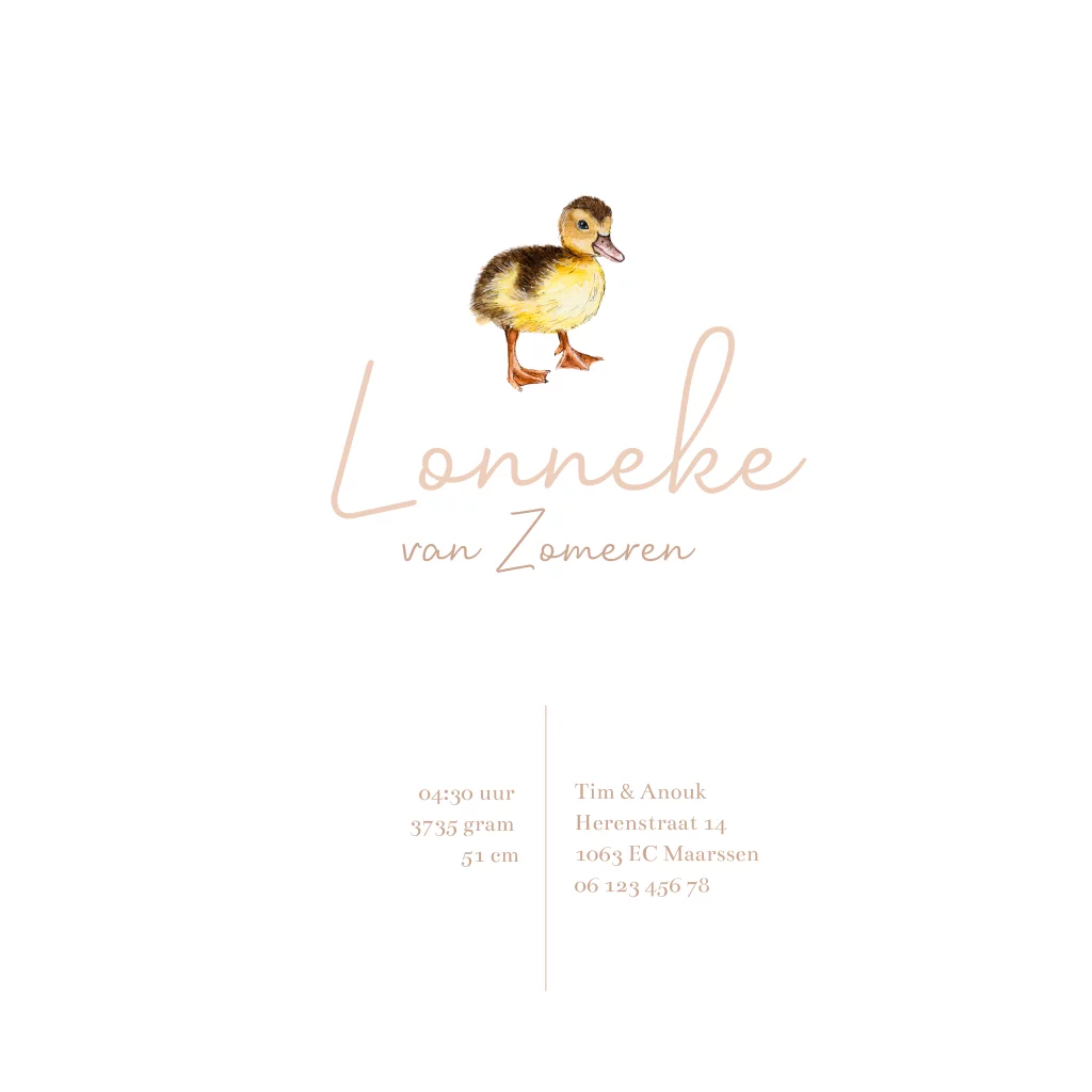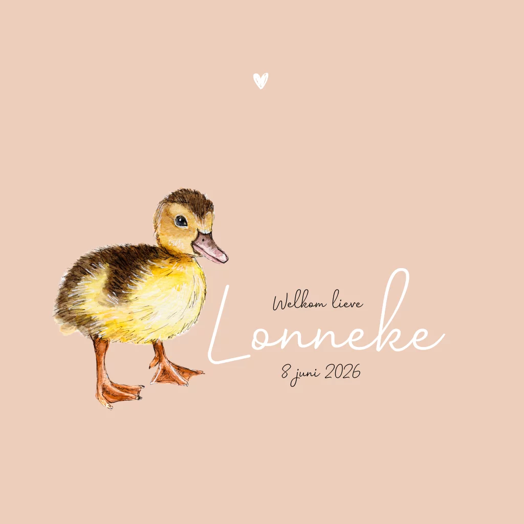 Schattig baby eendje, met de hand getekend en afgewerkt met aquarel. Maak van dit geboortekaartje door verschillende kleuren en lettertypes er je eigen ontwerp van.