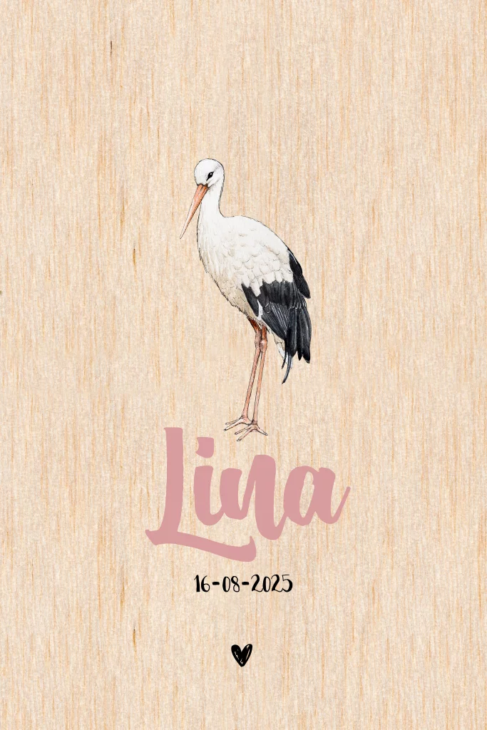Enkel staand geboortekaartje ooievaar Hout Meisje