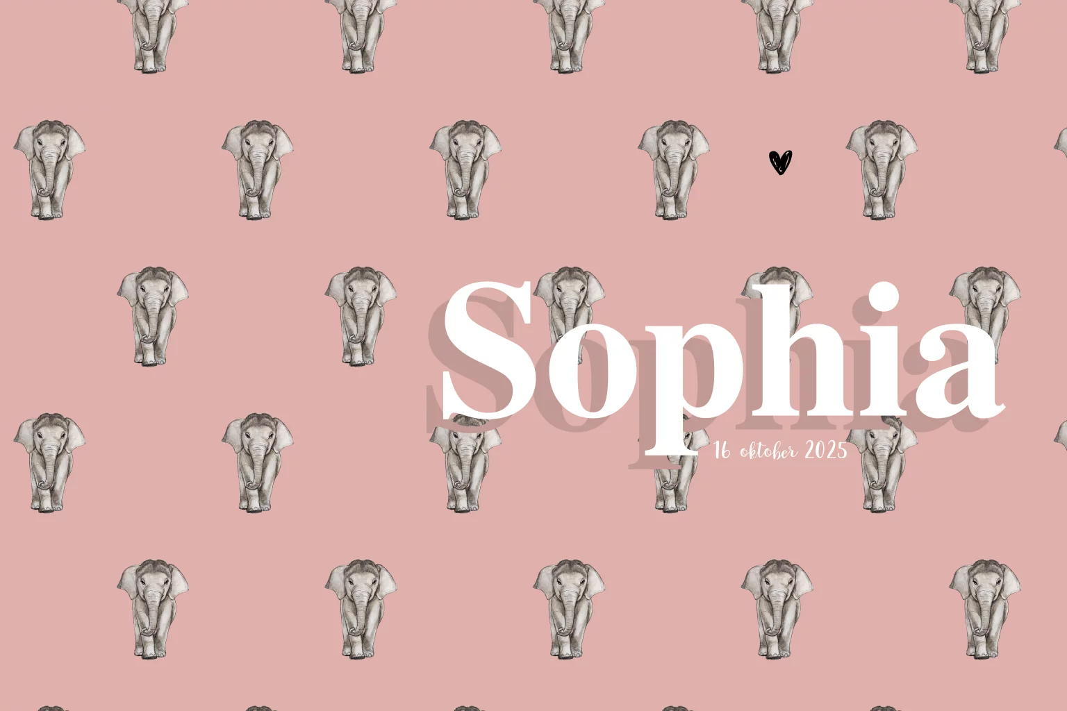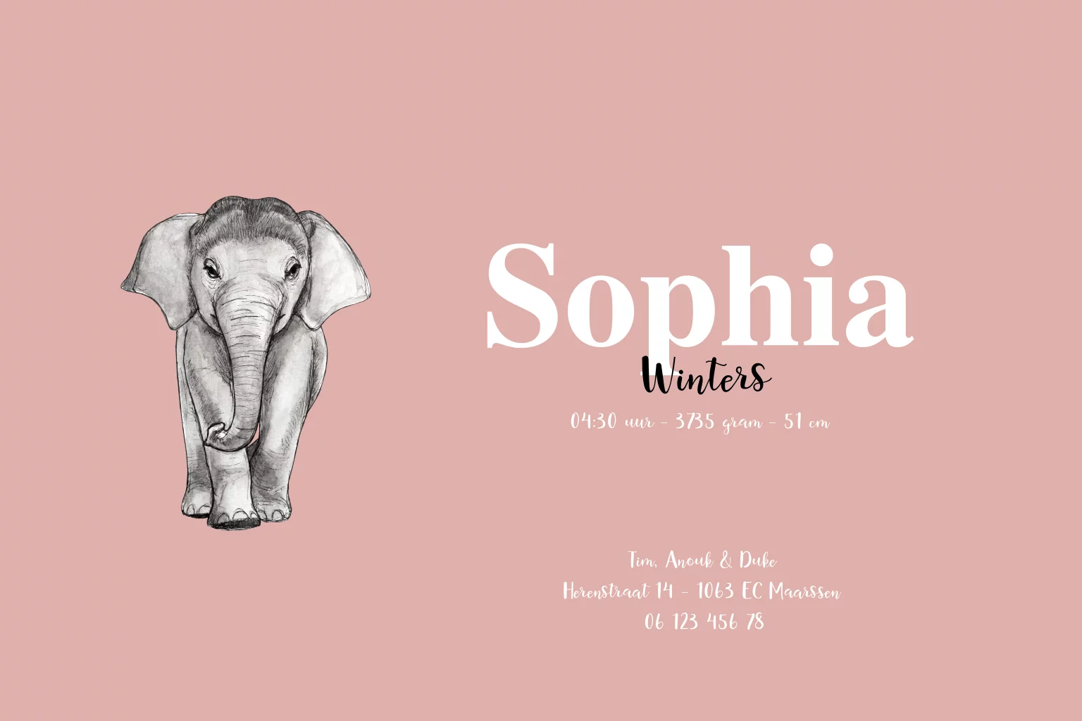 Geboortekaartje meisje met een patroon van een baby olifant, met de hand getekend en afgewerkt met aquarel. Maak van dit geboortekaartje door verschillende kleuren en lettertypes er je eigen geboortekaartje van.